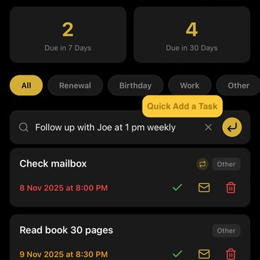 Take control of confidential, long-term personal dates, shield birthdays, renewals, and key events from shared calendars, get multiple advance alerts, and delegate instantly with one-click emails to your assistant if needed.